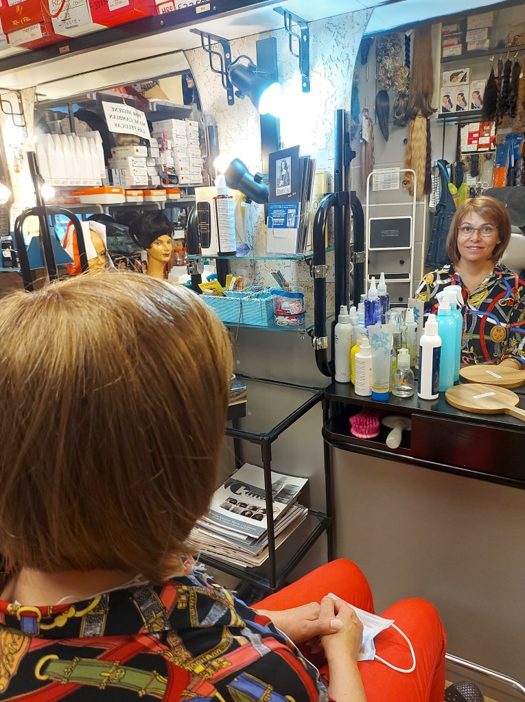 La caída del pelo la llevó bien. Tanto ella como yo pensamos que nos chocaría, que nos impactaría, pero la verdad es que no. También se fue cortando el pelo de forma progresiva. Dejó atrás la melena para cortárselo a la altura de los hombros. Después se lo cortó un poco dos veces más hasta que llegó el punto de raparse porque no quedaba otra. Nos habíamos preparado. Habíamos ido a una tienda de pelucas a comprar una y también tenía varios pañuelos y gorritos. Verla rapada no me impresionó y a ella tampoco. Utilizaba la peluca para salir de casa, pero dentro siempre llevaba un gorro.